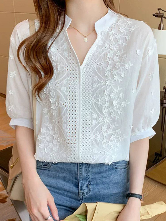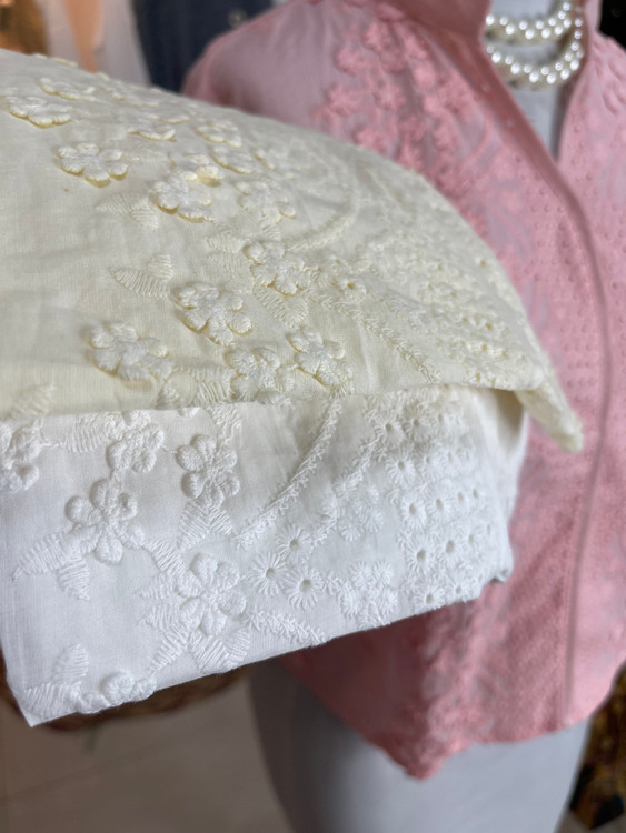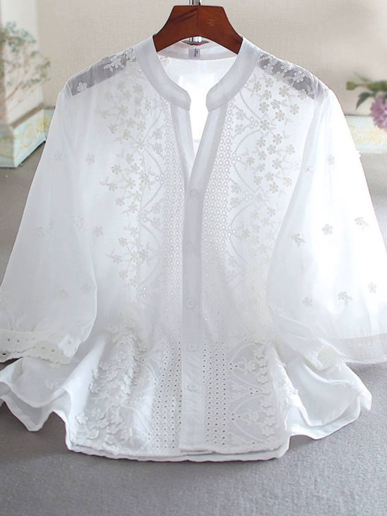 🦋 شومیز خامه دوزی کل برجسته جنس نخی آستین سه ربع وارداتی🦋سایزبندی فری سایز تا ۴۴